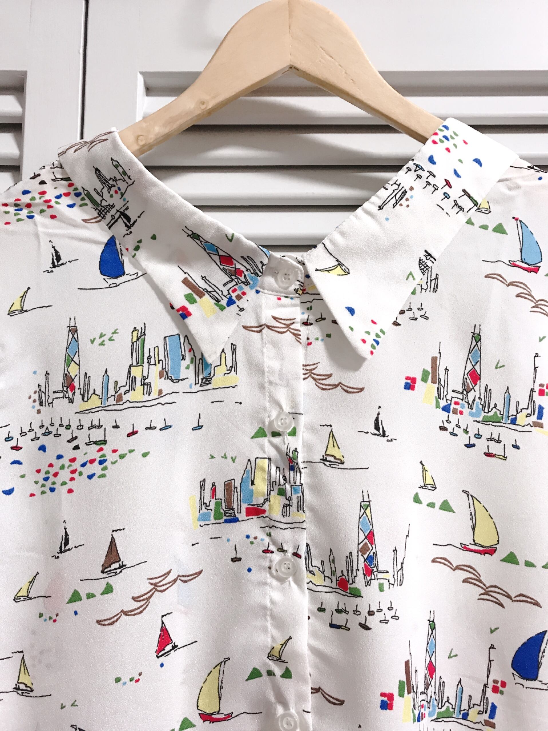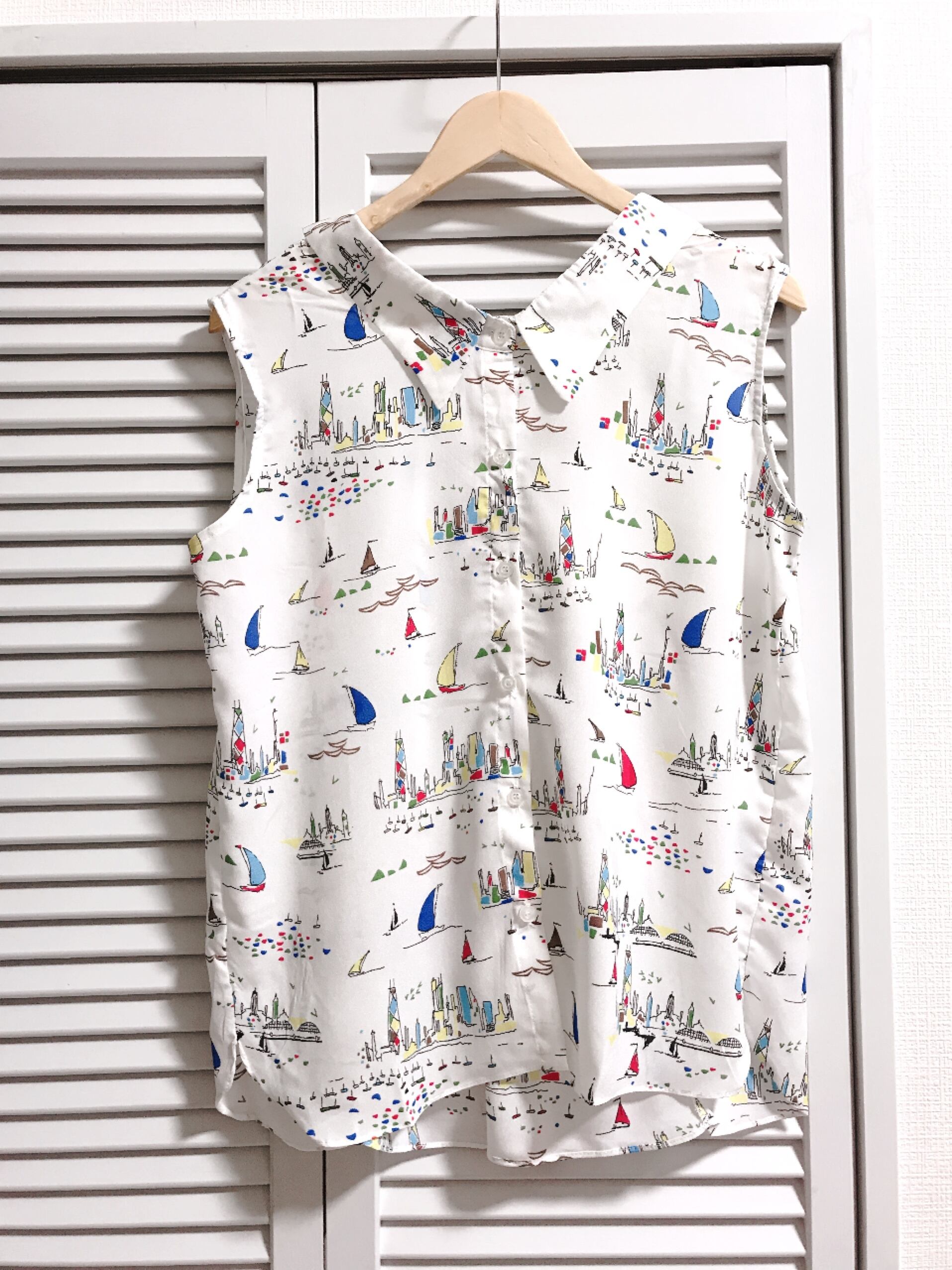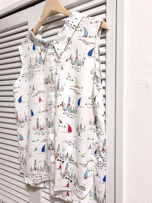 ヨット柄が涼し気な、襟付きVネックのノースリーブプルオーバー