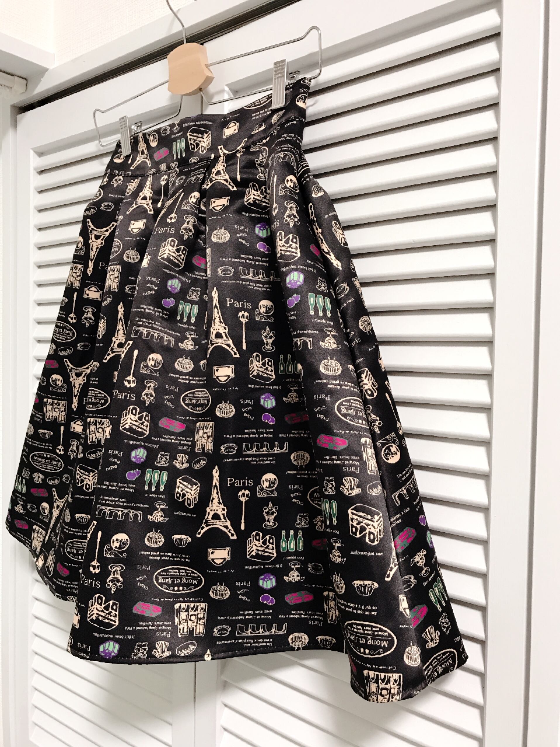 光沢があって高級感のある生地にエッフェル塔やケーキ、小物の絵が描かれたフレアスカート♡