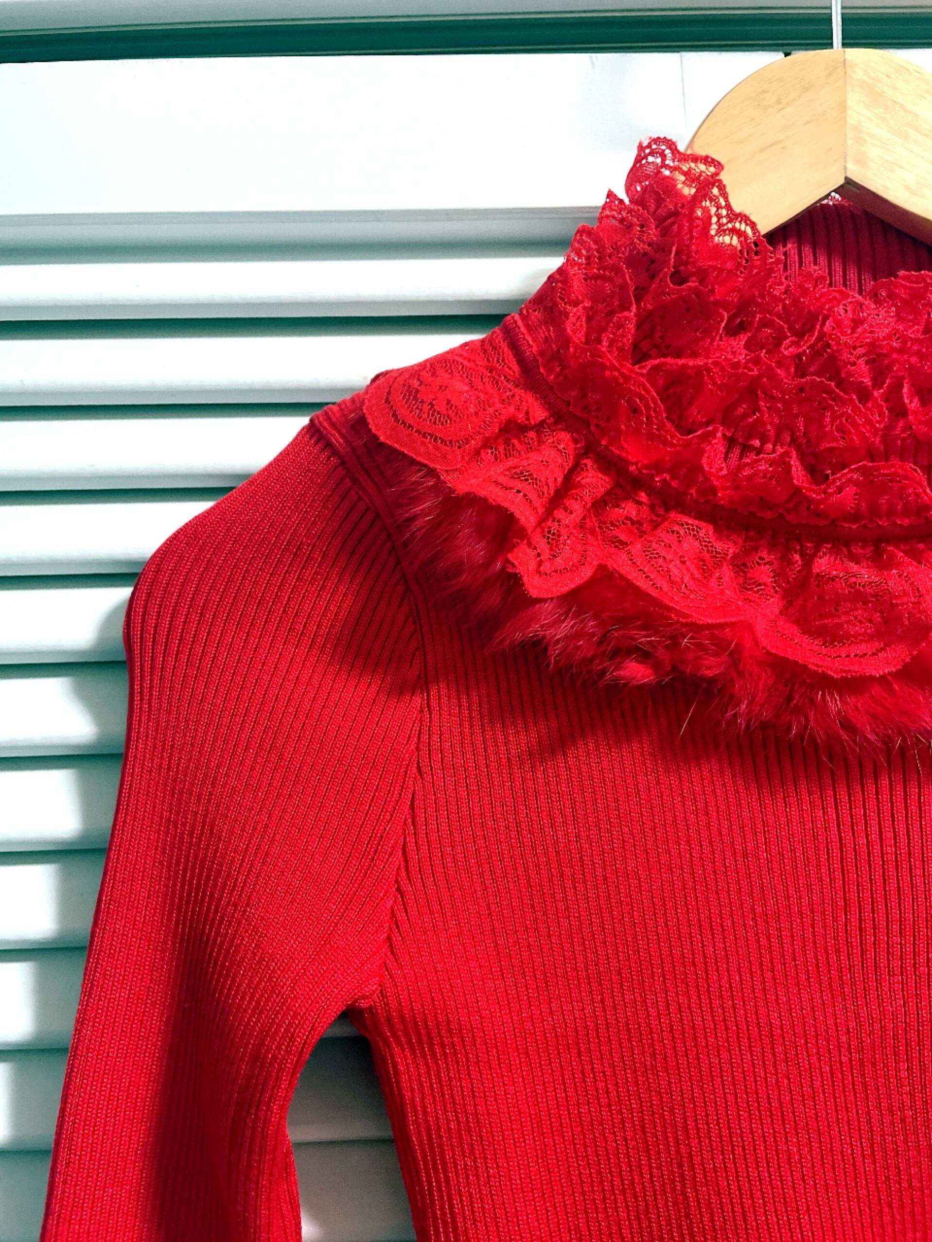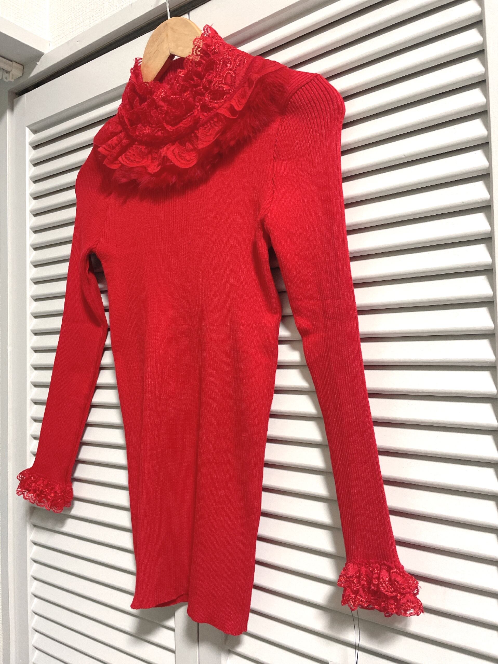 首元のフリルとファーがゴージャスなハイネックリブニット