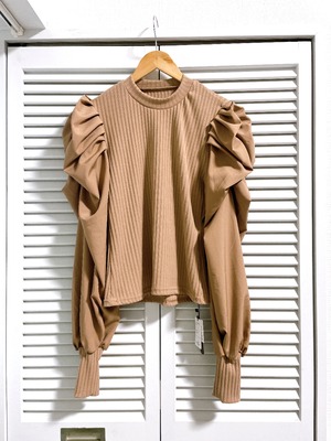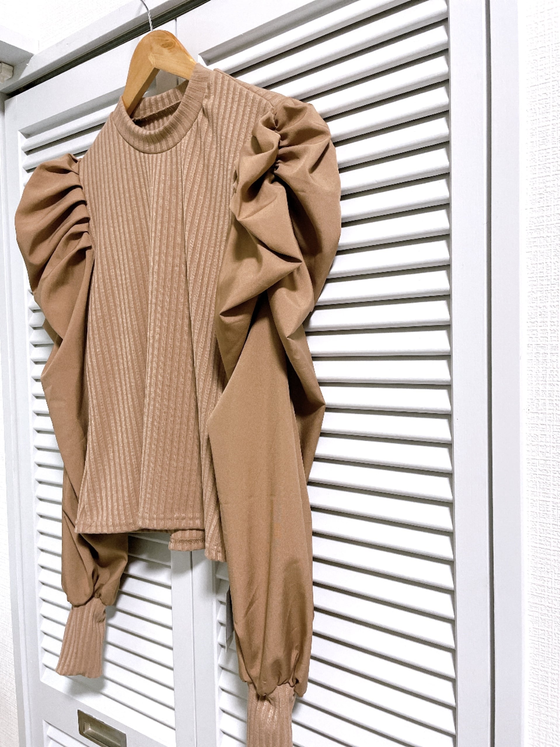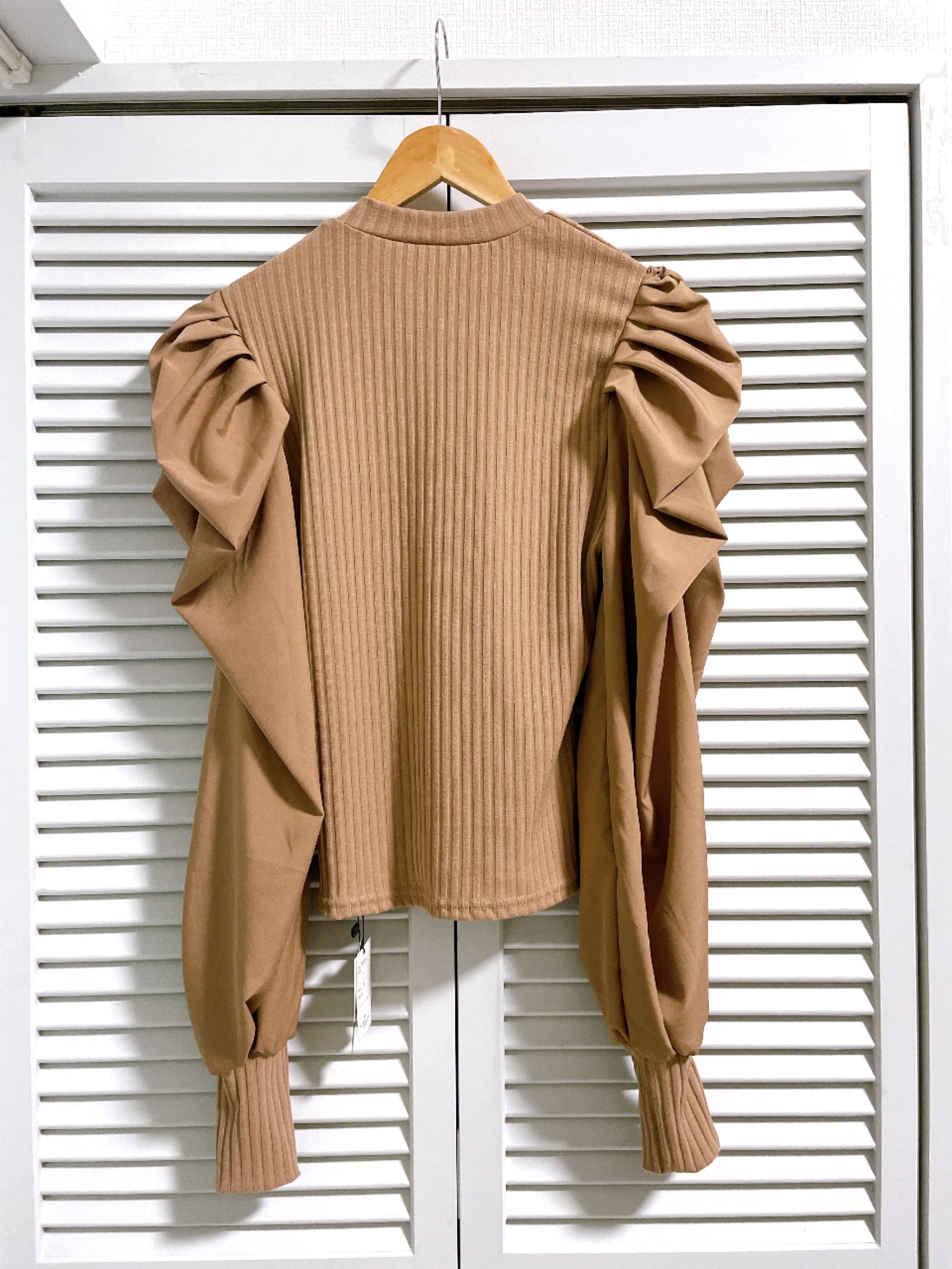 ボリューム感のあるシャーリングのパフスリーブがゴージャスなリブトップス♡