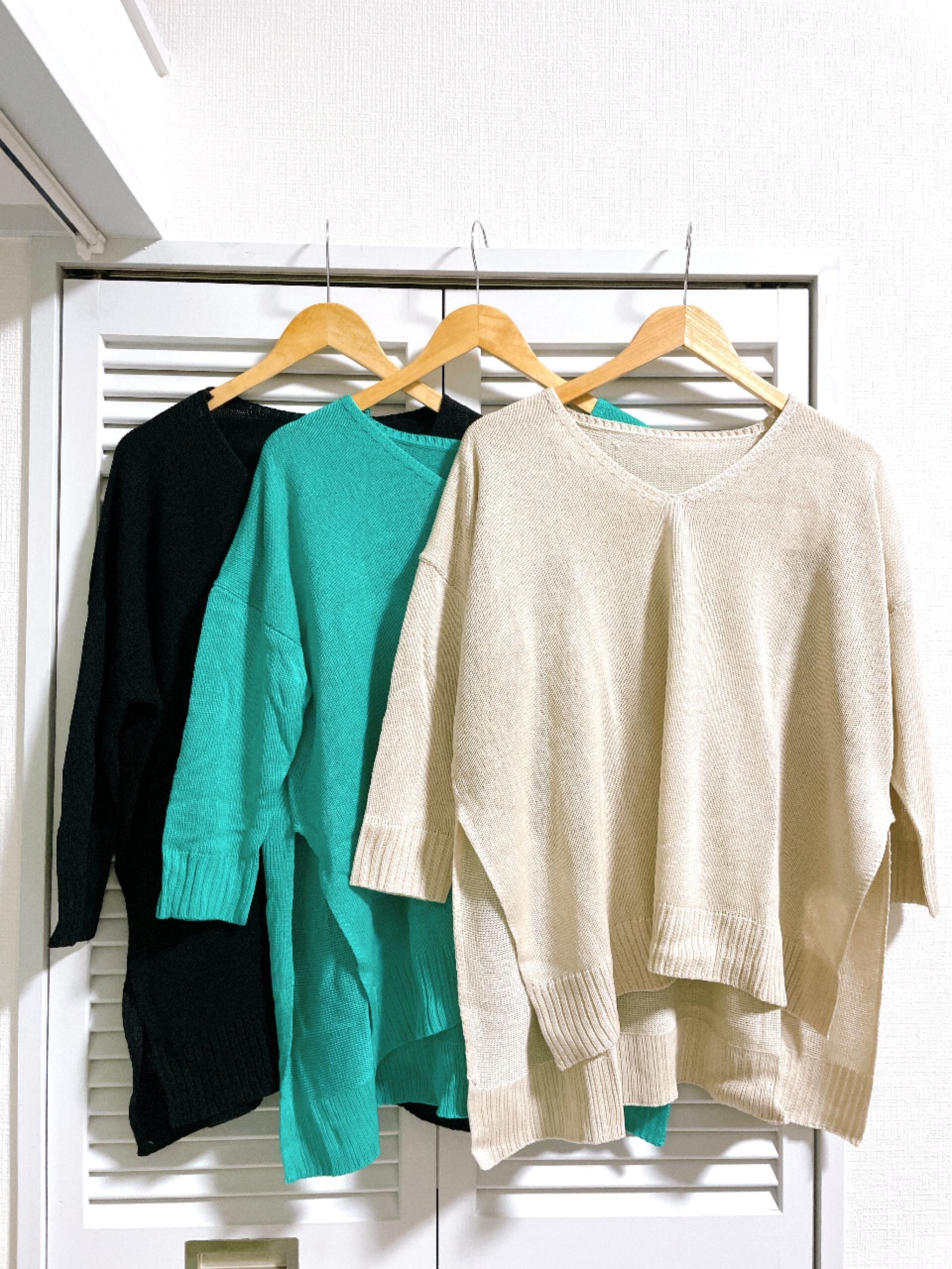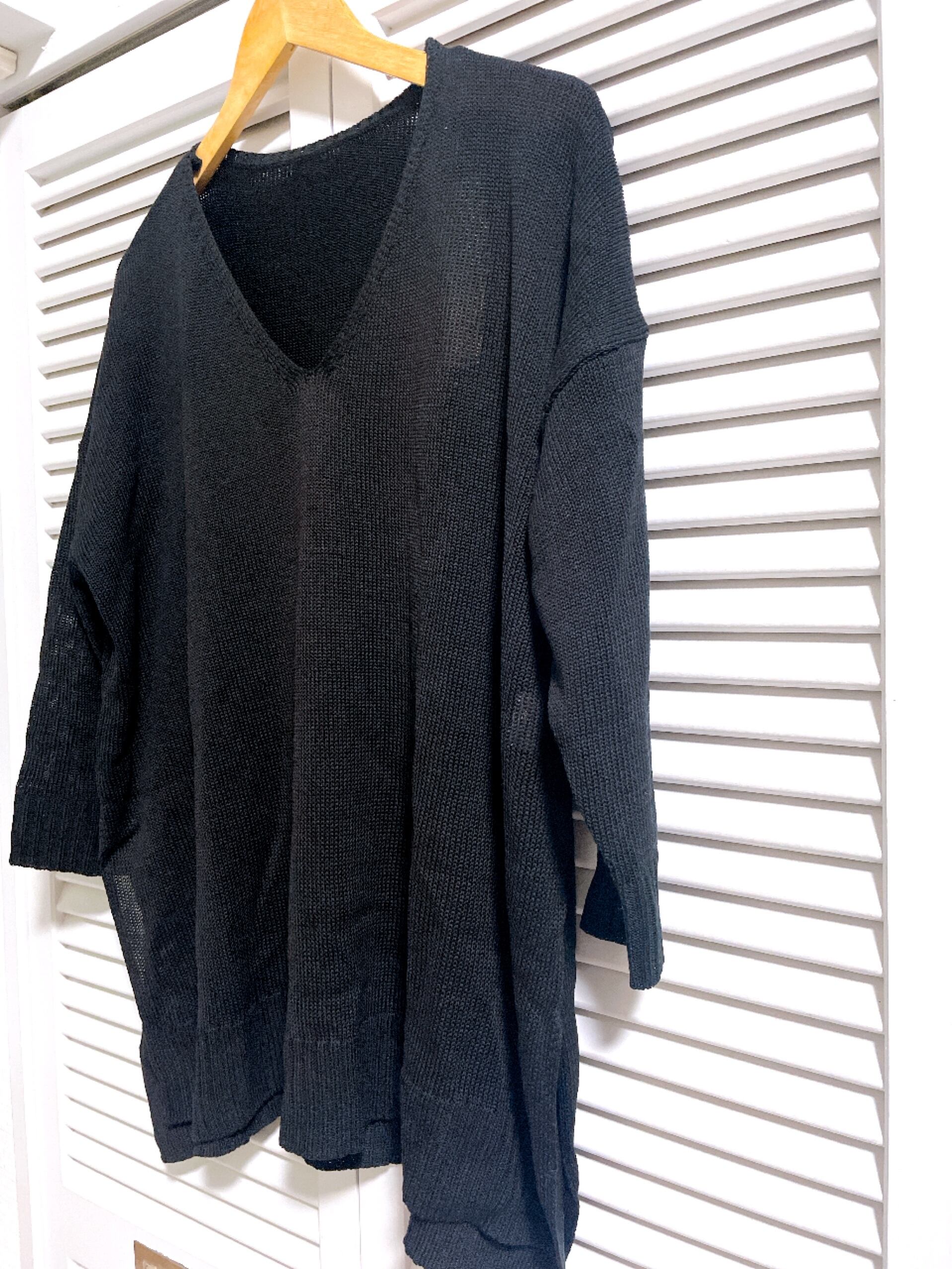 後ろの丈が長めになったVネックのサマーニット