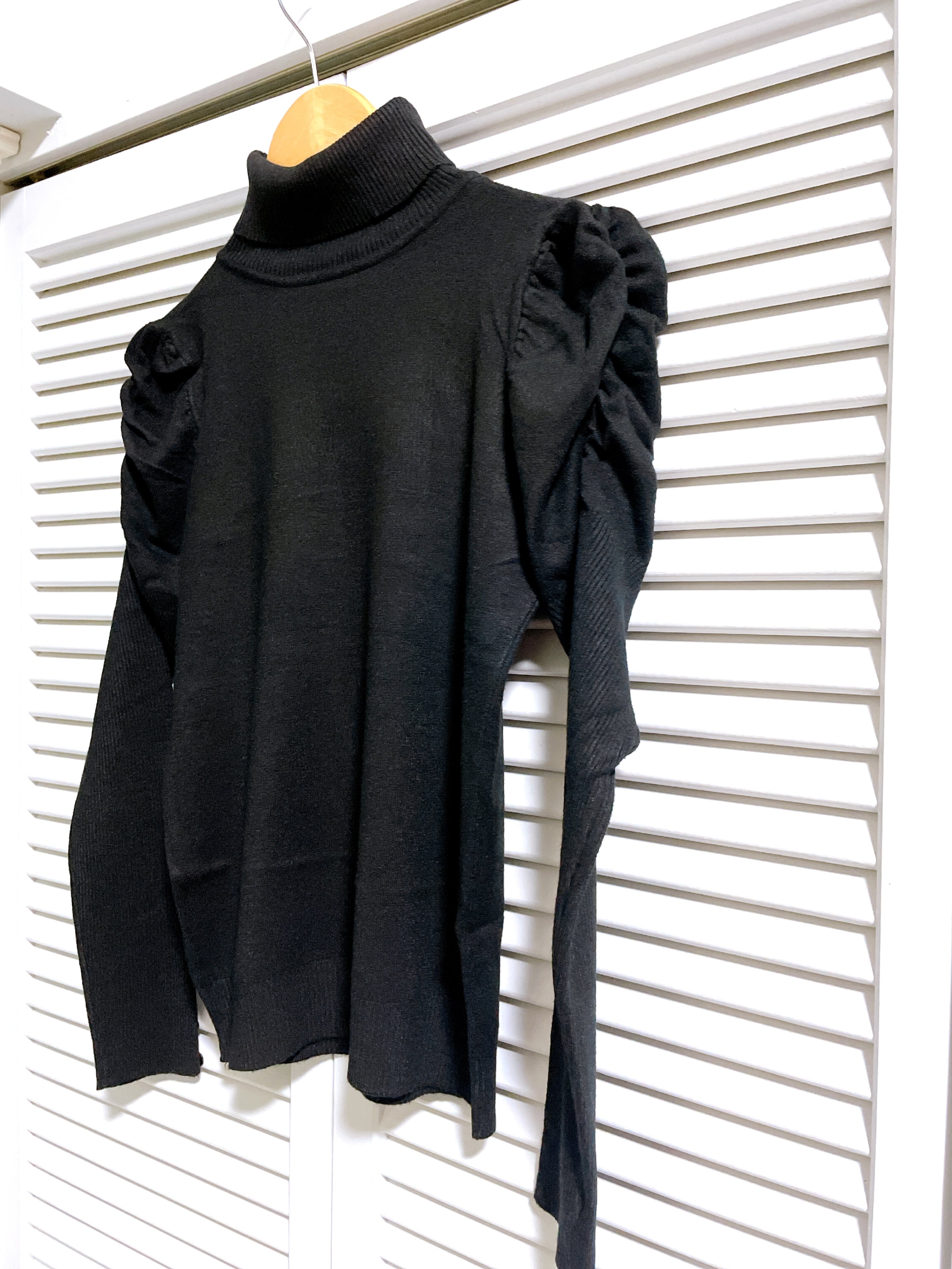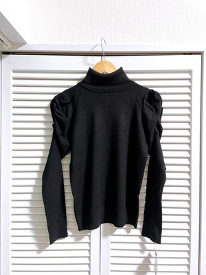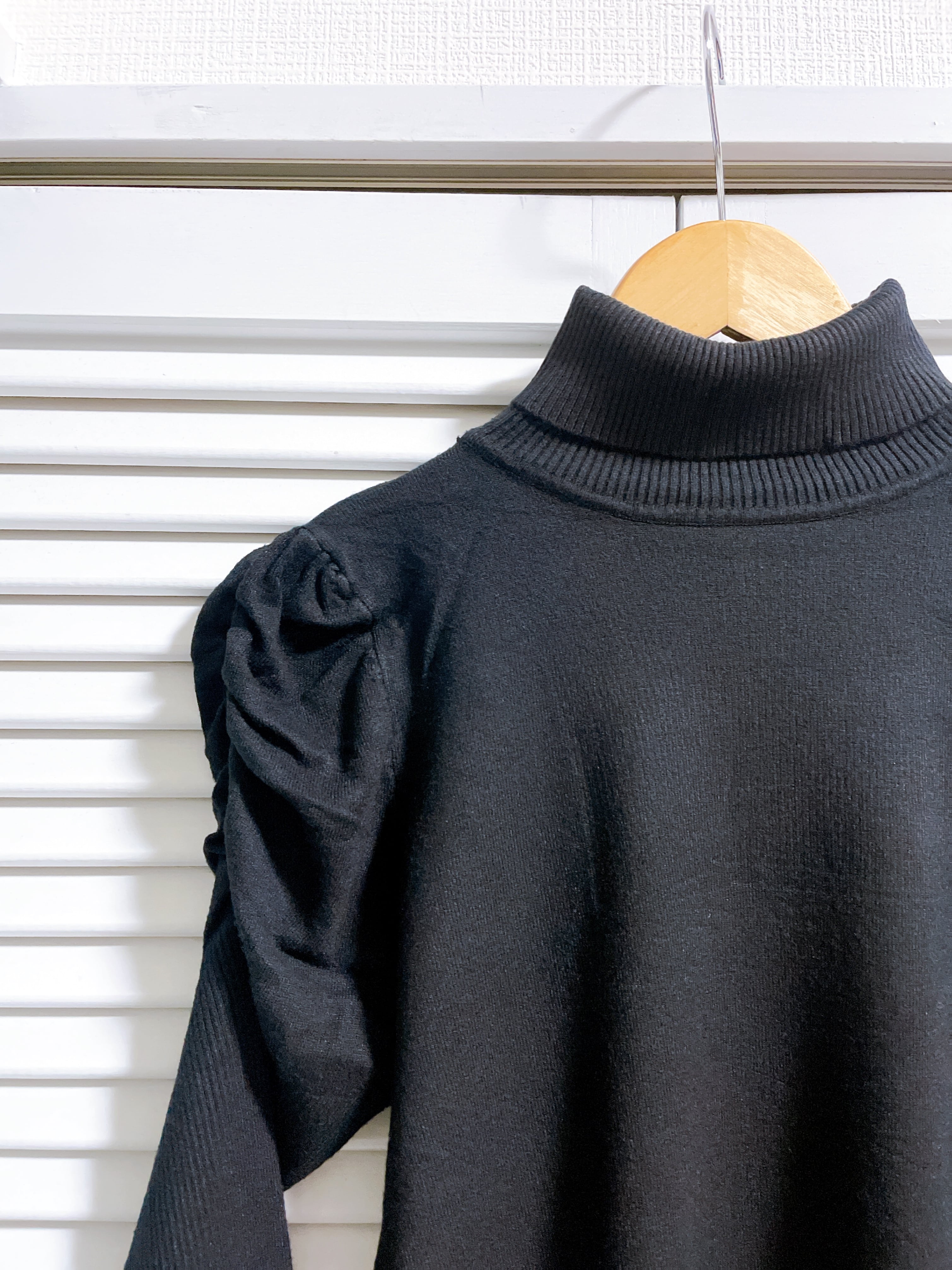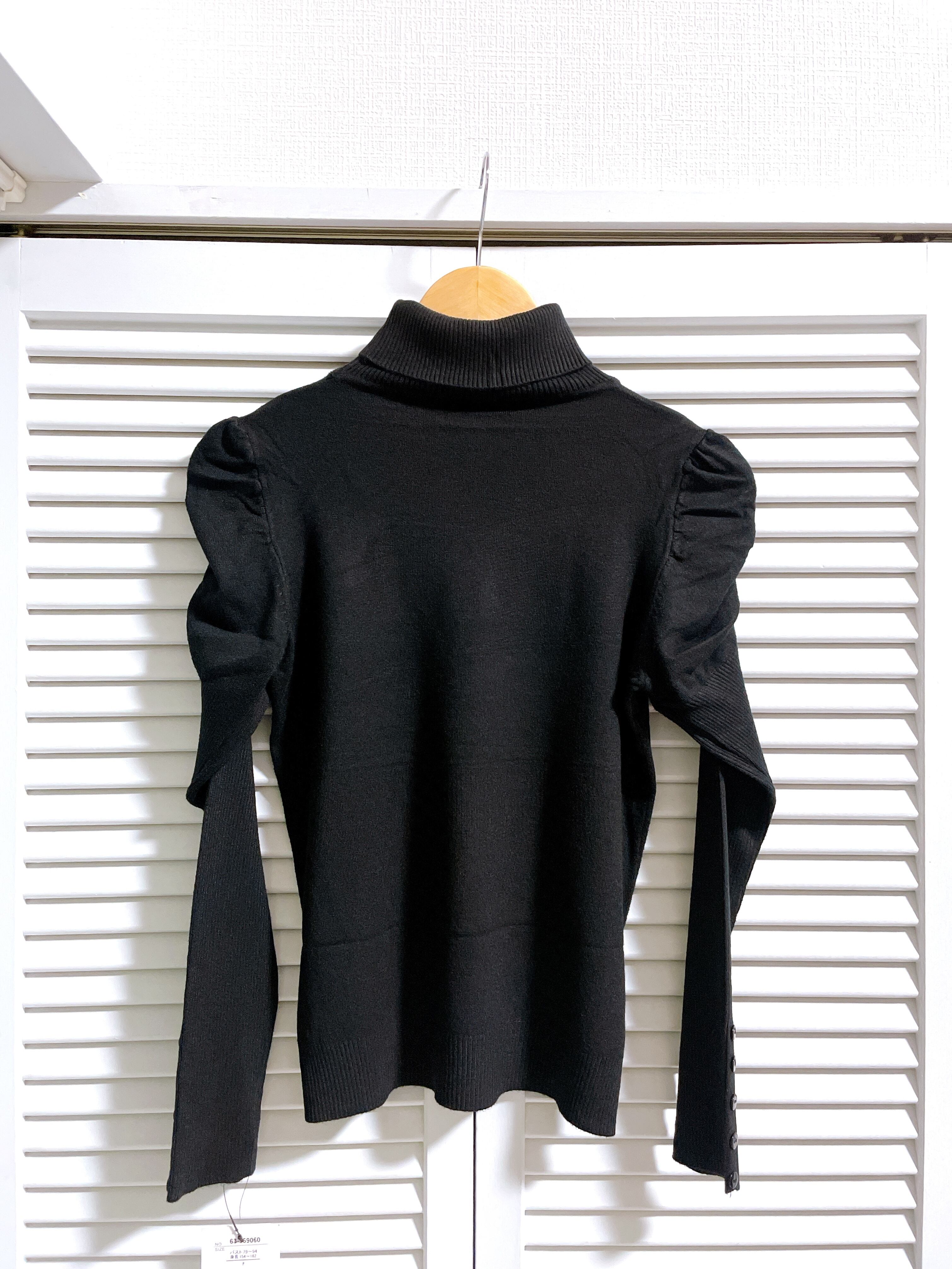 袖ボタンのパフショルダー柔らかタートルネックニット ブラック