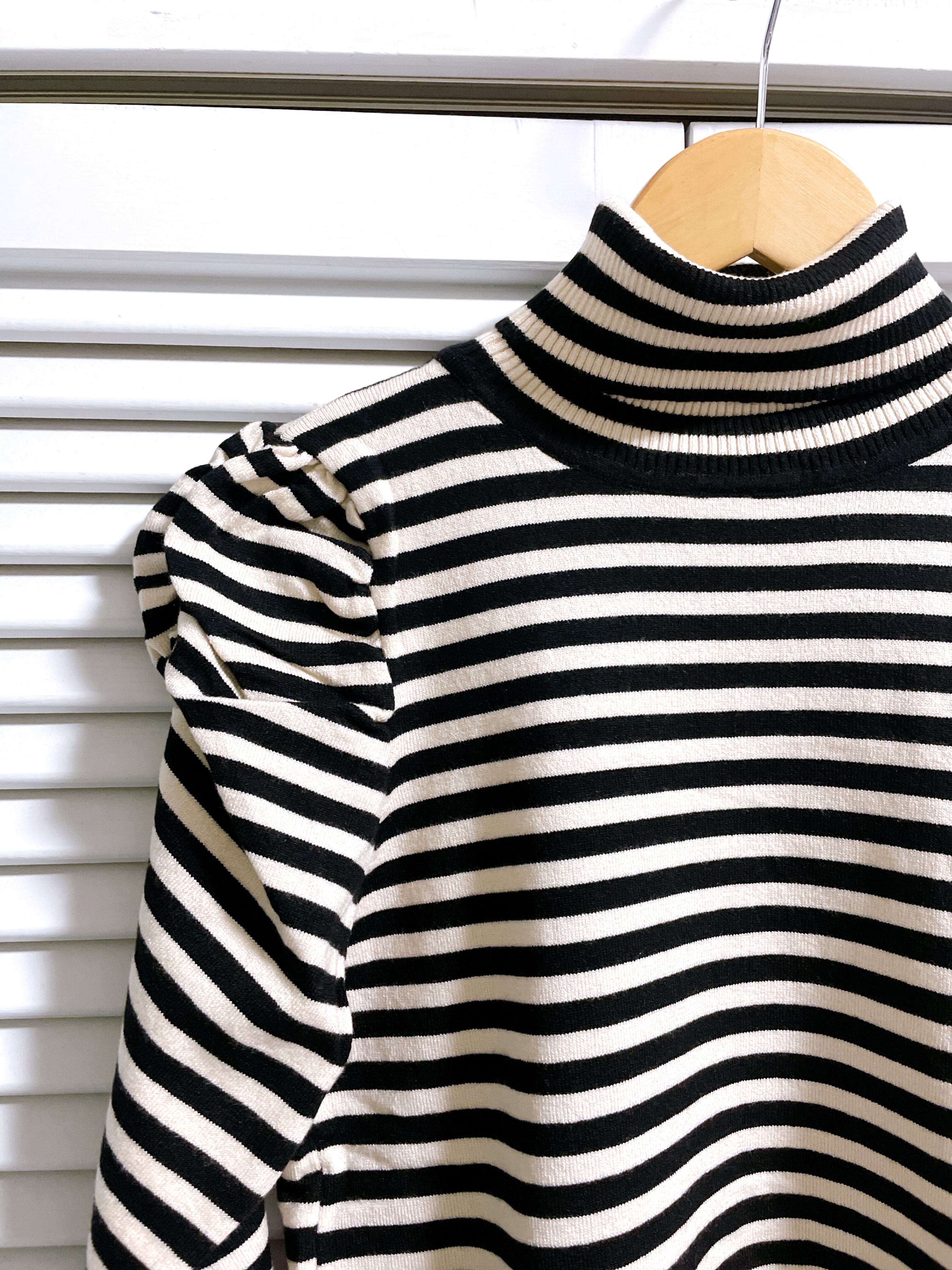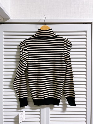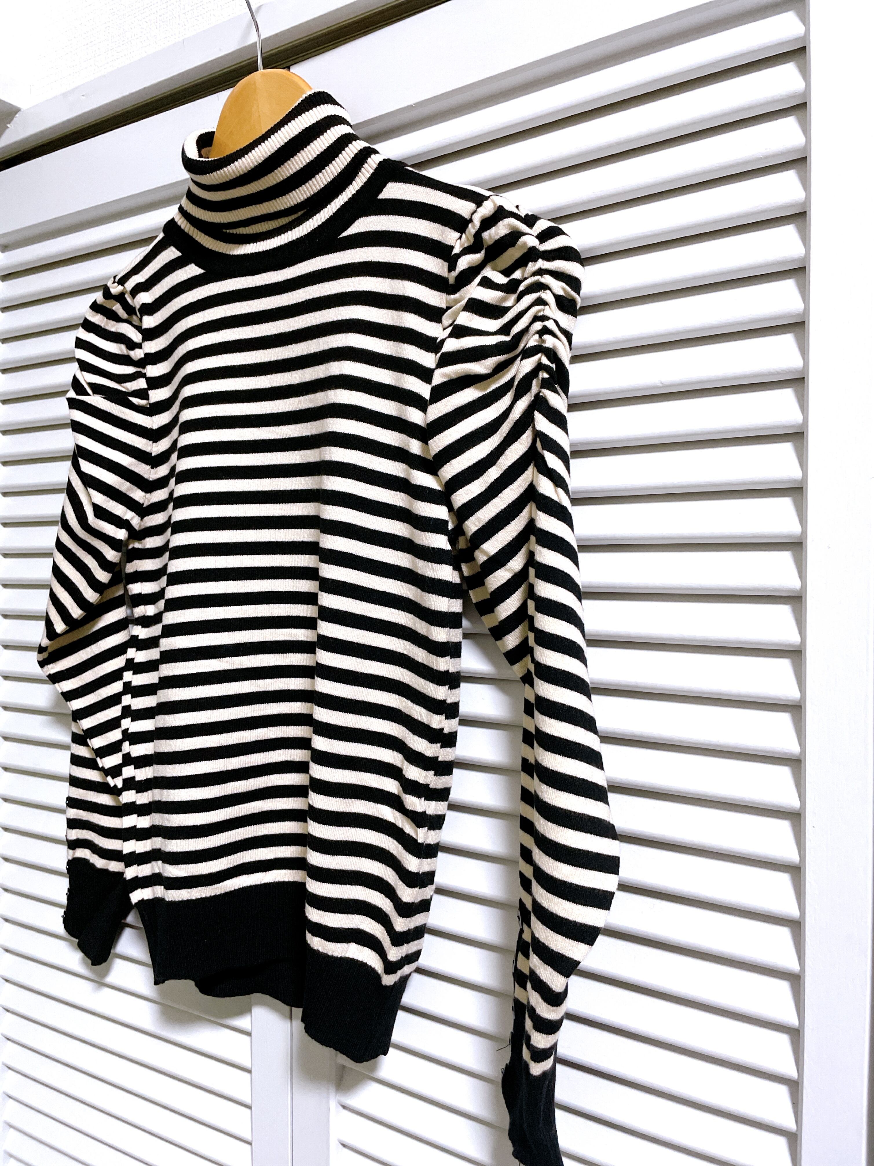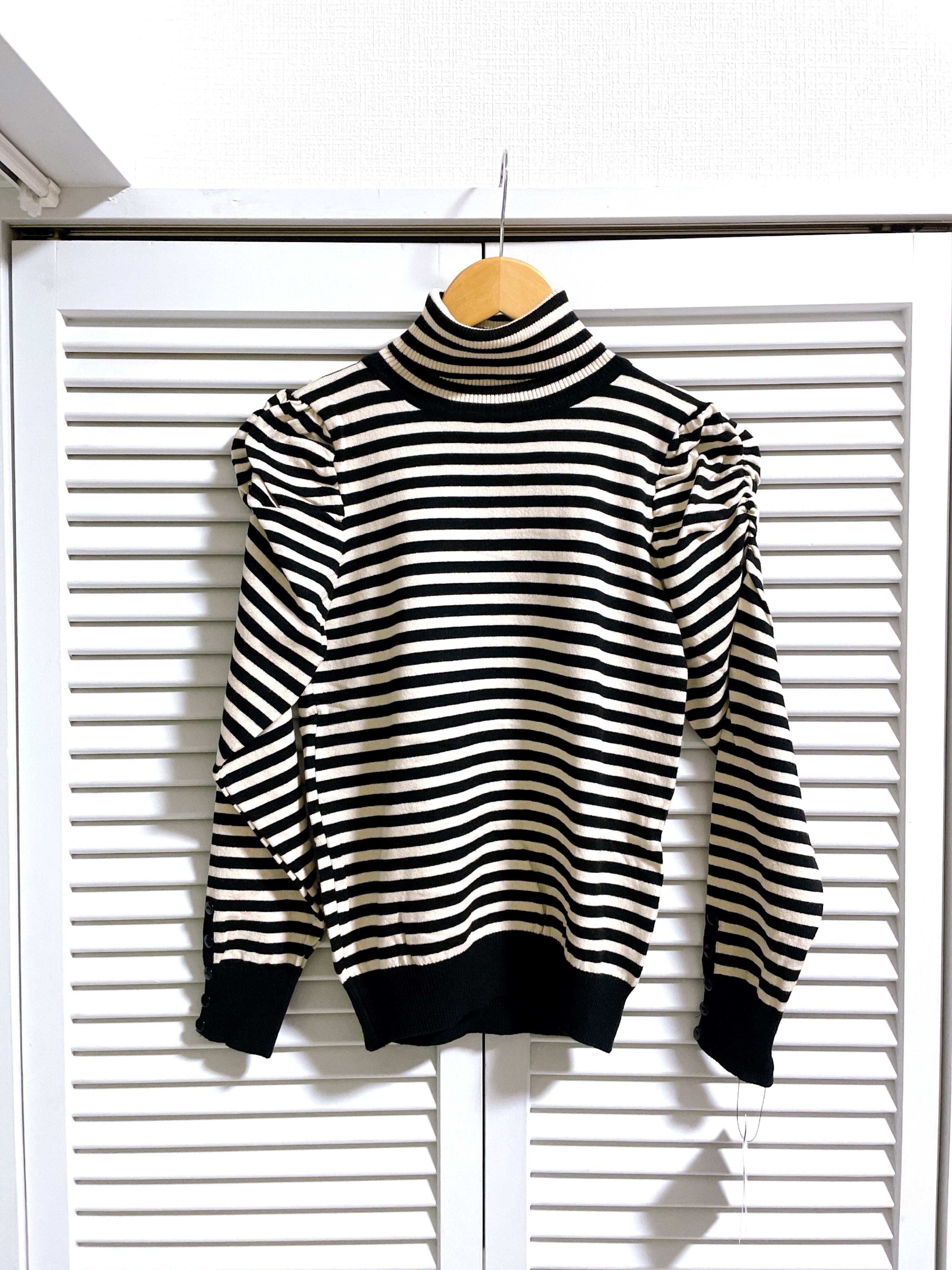袖ボタンのパフショルダー柔らかタートルネックニット ボーダー