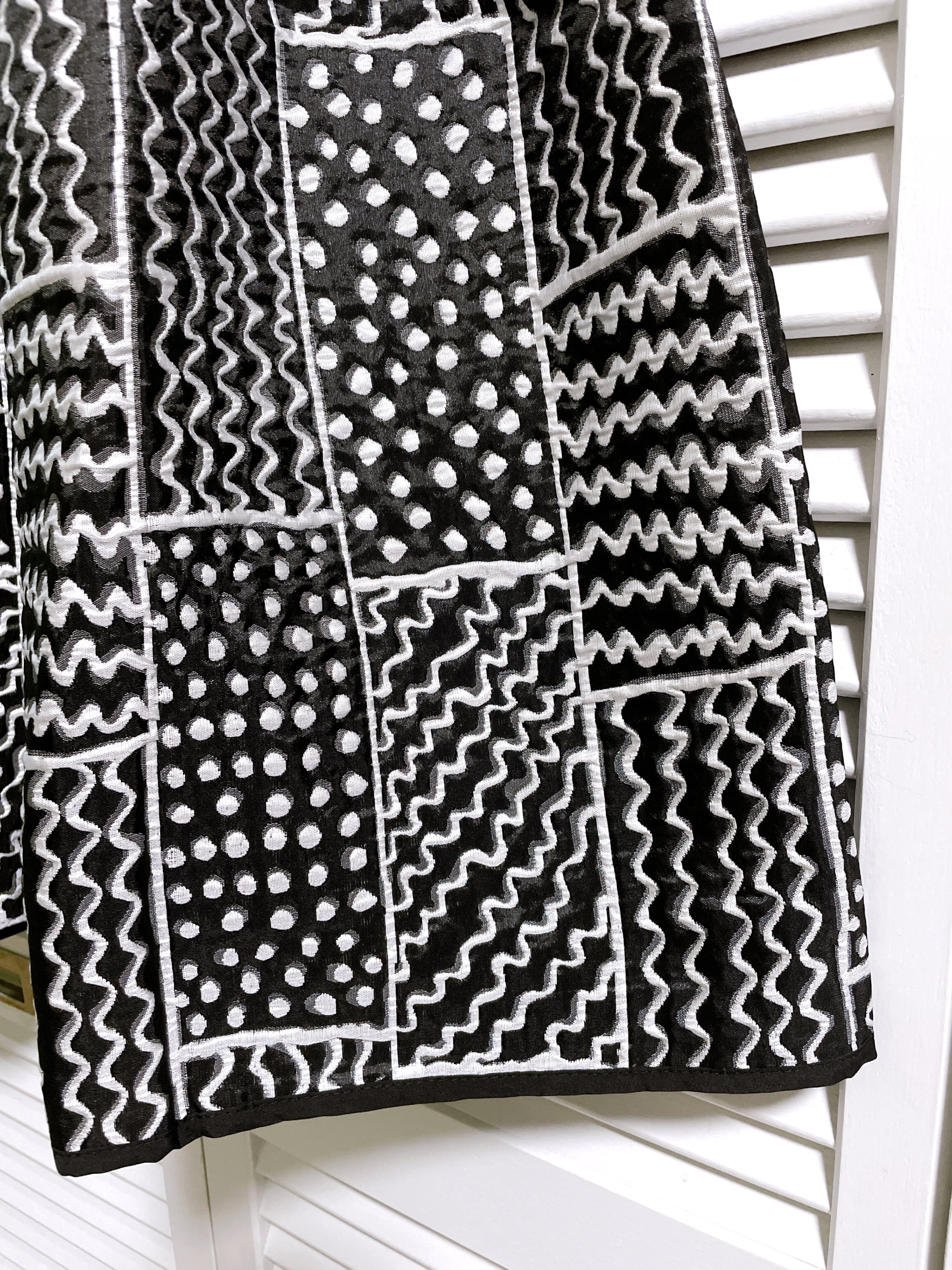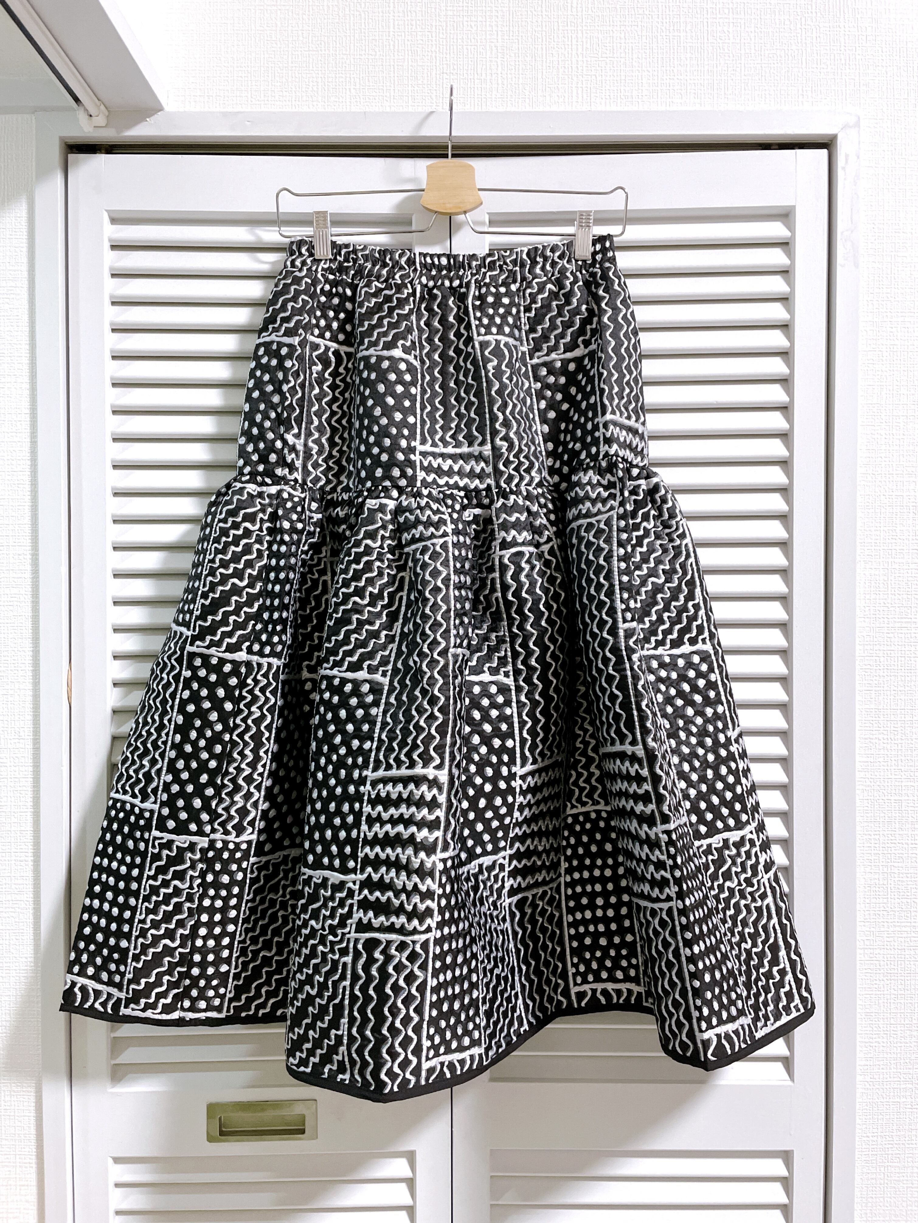ハリのあるエンボス模様の生地で、切り替えのあるフレアスカート