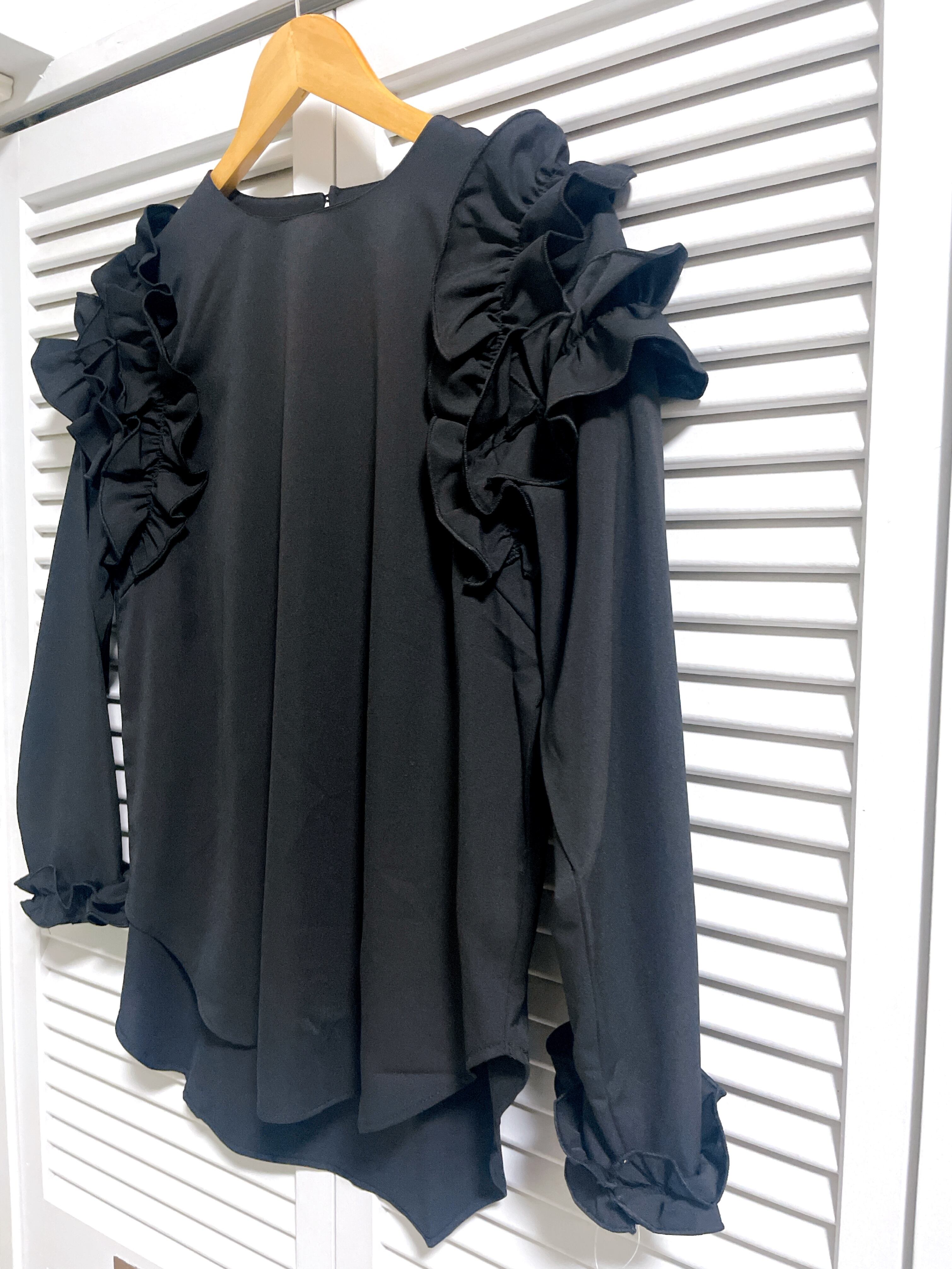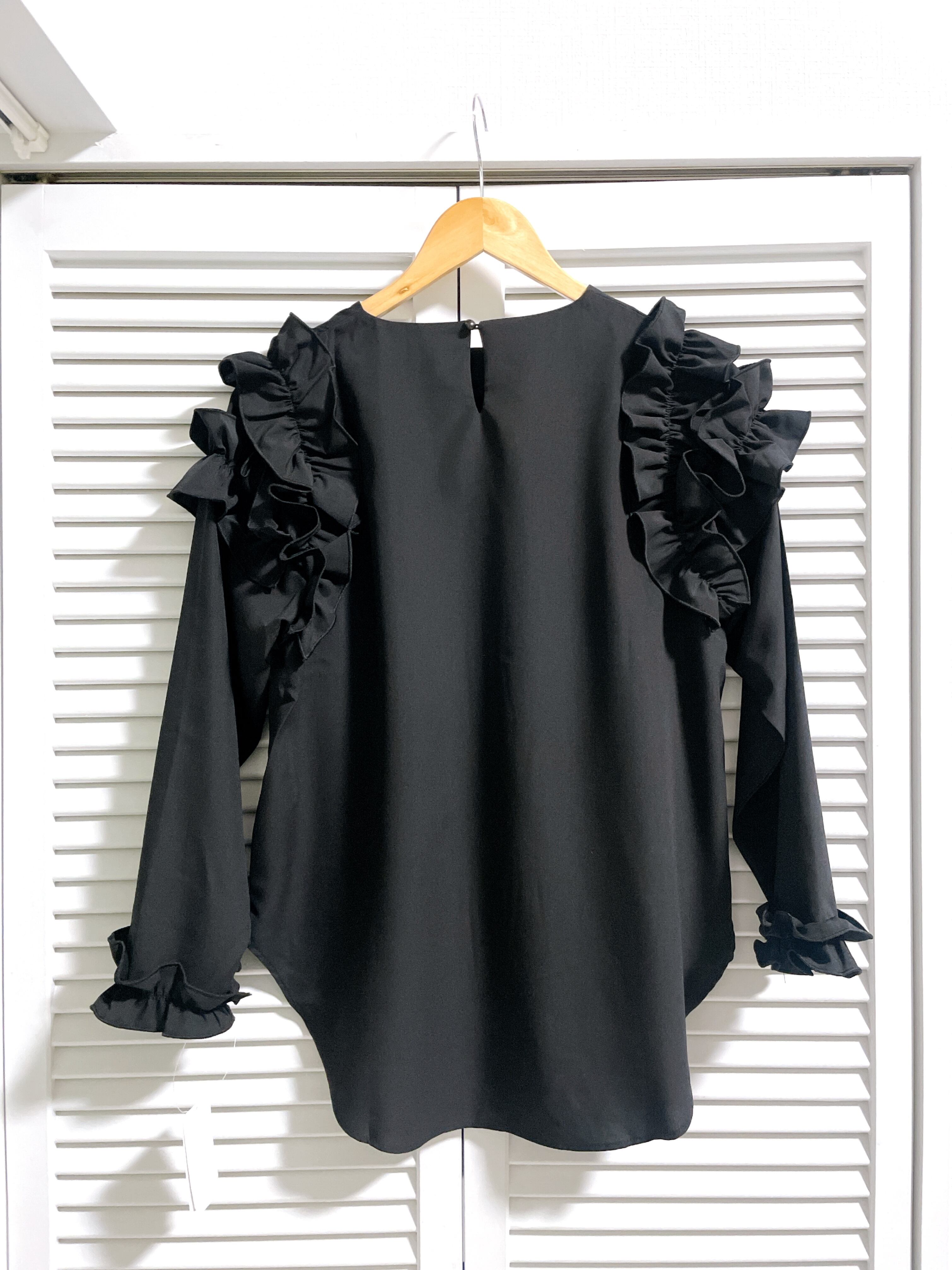 肩フリルの長袖トップス ブラック